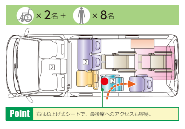 車椅子のまま車内に乗り込むことが出来る為、車のシートに長時間座ることが難しい重度の方、乗り移りが困難な方に適しています。